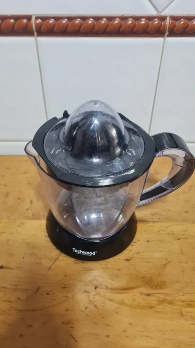 Exprimidor de cítricos eléctrico de la marca Techwood. Ideal para preparar zumos frescos. - Diseño transparente. - Asa ergonómica. - Base antideslizante.