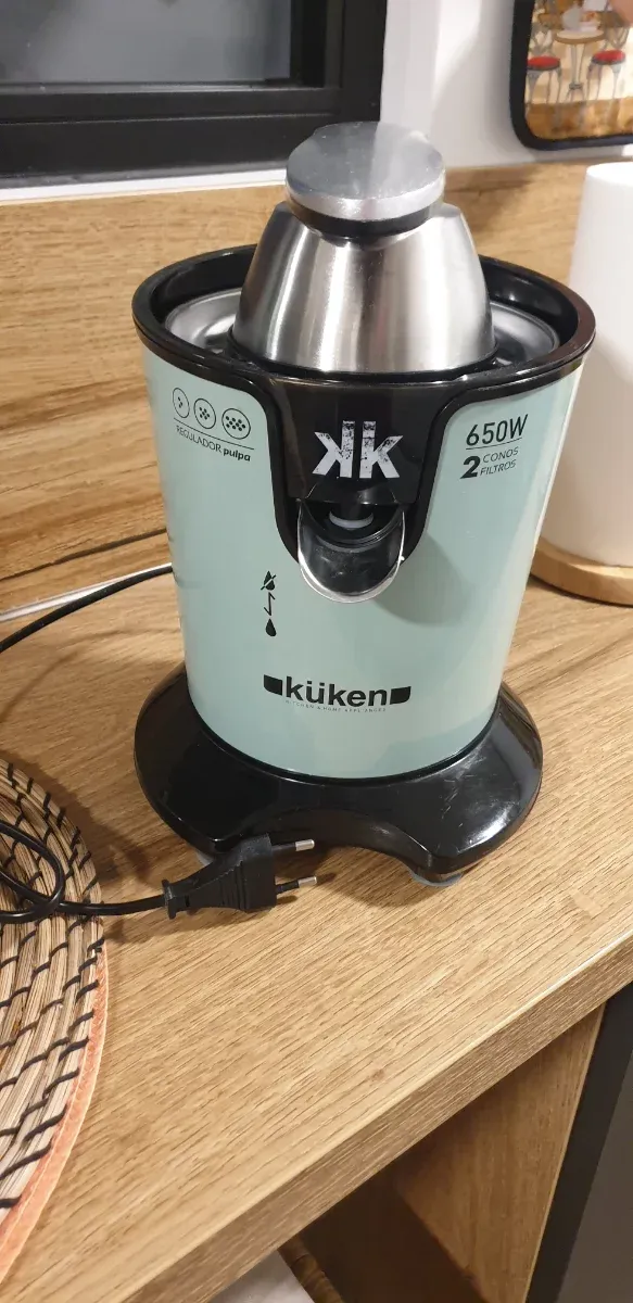 Exprimidor de zumo de la marca KUKEN en color verde menta. - Potencia de 650W. - Incluye 2 conos y 2 filtros. - Regulador de pulpa.