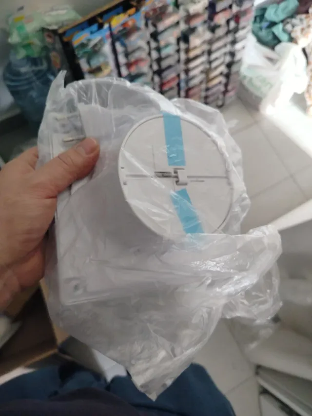 Extractor de aire para ventilación. - Diseño circular blanco. - Cinta azul de sujeción.