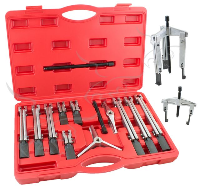Extractor de rodamientos universal. Guía central para extractor de 2 brazos. Longitud de: 175 mm. Guía central para extractor de 3 brazos de Ø 180 mm. Tornillo de extracción con bola de centrado de 175 mm. Tornillo de extracción con bola de centrado de 275 mm. 3 Garras o extractores de 115 mm de longitud. 3 Garras o extractores de 230 mm de longitud. 3 Garras o extractores de 280 mm de longitud. Rango del extractor de 2 garras: Ø 40 a 135 mm (de forma externa) - Ø 70 a 160 mm (de forma interna).