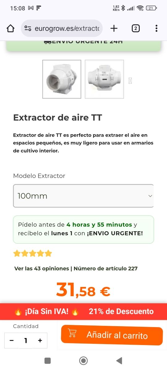 Detalles del productoExtractor de aire TT 100mm, ideal para espacios pequeños. Es ligero y perfecto para armarios de cultivo interior.