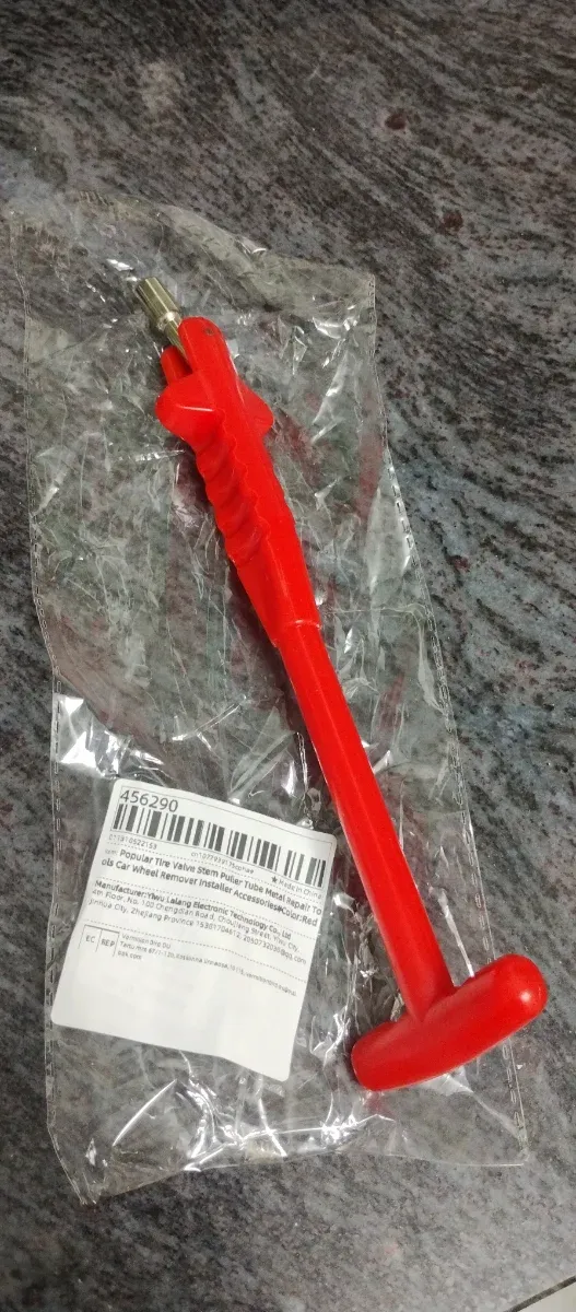 Herramienta para extraer e instalar válvulas de neumáticos. - Mango de plástico rojo. - Punta metálica. - Útil para coches y otros vehículos.