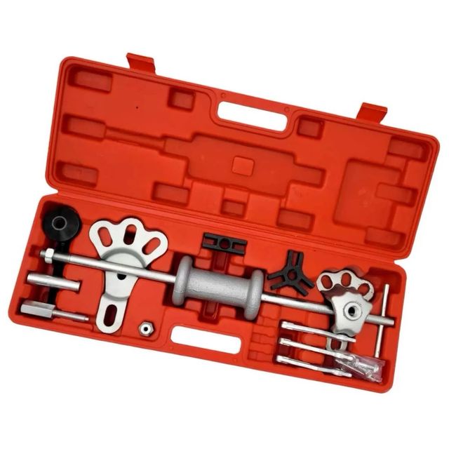 El juego incluye las herramientas necesarias para este trabajo: martillo deslizante, martillo deslizante, dos adaptadores de cubo de rueda, un extractor de dos brazos y un extractor de tres brazos, un extractor de tres brazos, tres mordazas de extractor, un adaptador de mordaza y una abolladura. Adaptador de reparación. Recibirá las herramientas cuidadosamente guardadas en una caja para un uso práctico y móvil.