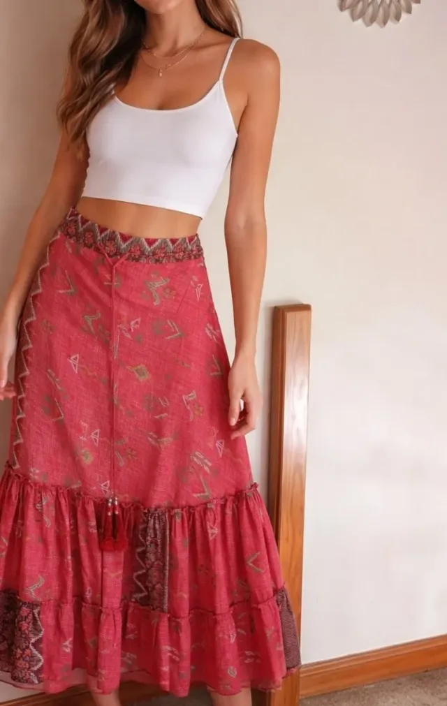 Falda larga de estilo boho con un estampado vibrante y detalles étnicos. Perfecta para un look casual y a la moda.