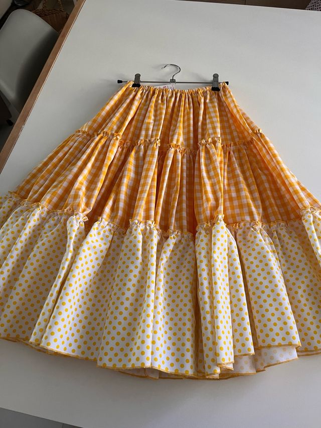 Detalles del productoFalda canastera larga, hecha a mano y a estrenar. Su diseño combina un alegre estampado de cuadros amarillos con lunares.