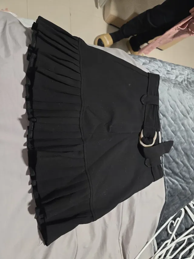Detalles del productoFalda corta negra con un diseño moderno y detalles de volantes.