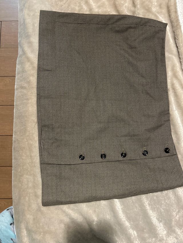 Falda con un estampado de cuadros clásico en tonos marrones y grises. Presenta un diseño elegante con detalles de botones en el bajo.