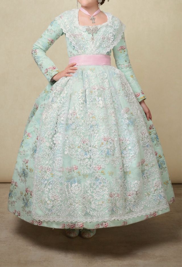 Traje de fallera para niña de 9 años, con un bonito estampado floral en tono verde clarito. zapatos talla 34 tela sobrante para mas zapatos Tela interior para sacar