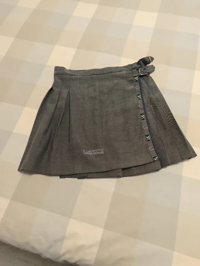Detalles del productoFalda gris de Iale School con detalles de botones y cinturón.