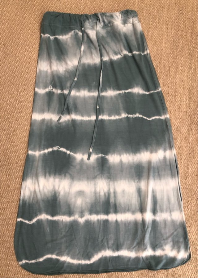 Falda larga con estampado tie-dye en tonos turquesa y blanco. Talla Unica ( largo aprox. 88 cm)