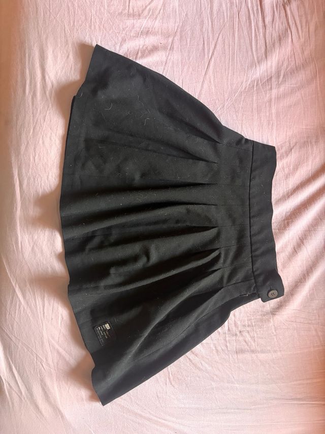 Falda negra con un diseño de dobladillos. - Cintura con cierre de botón. - Etiqueta interior visible.