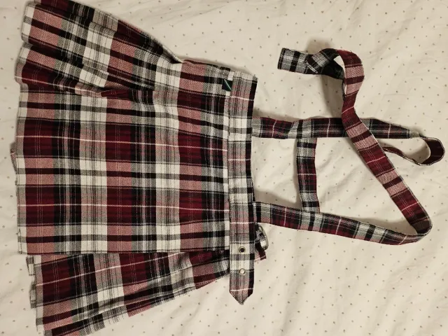 Falda de cuadros con tirantes. - Diseño de cuadros en tonos burdeos, blanco y negro. - Talla 4. - Incluye tirantes ajustables.