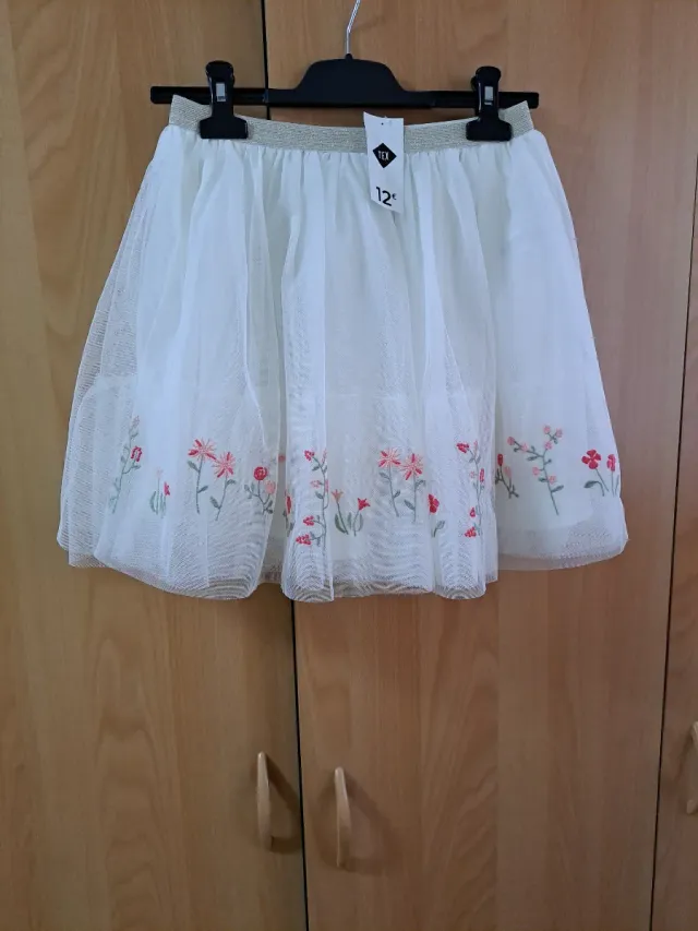 Preciosa falda de tul para niña de la marca TEX. - Color blanco. - Cintura elástica dorada. - Bordado de flores en el bajo.