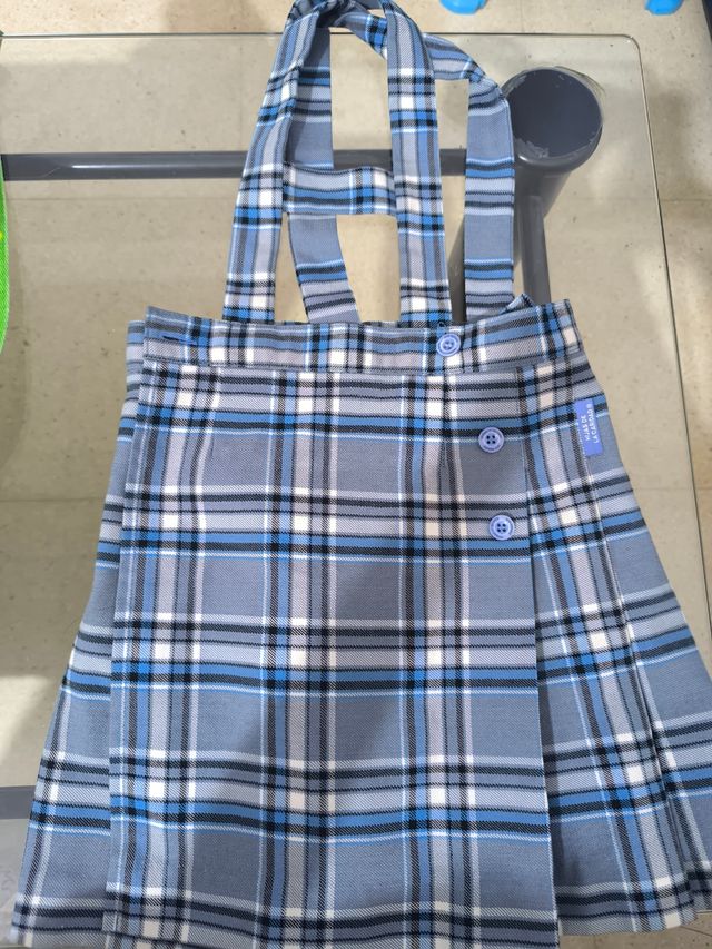 Detalles del productoFalda de uniforme a cuadros en tonos azules y blancos.