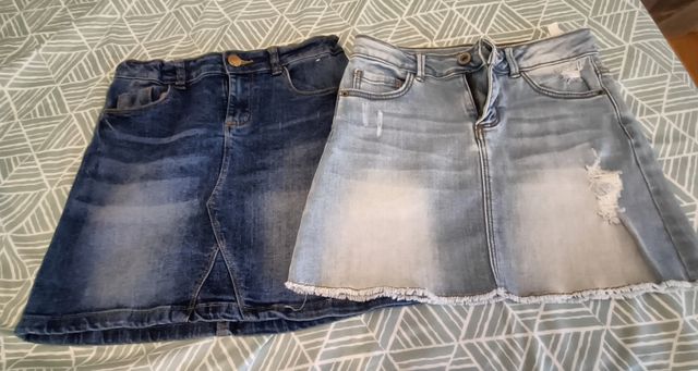 2 faldas vaqueras, la clarita es de Zara talla 8 y la más oscura es de Lefties talla 8-9 134cm