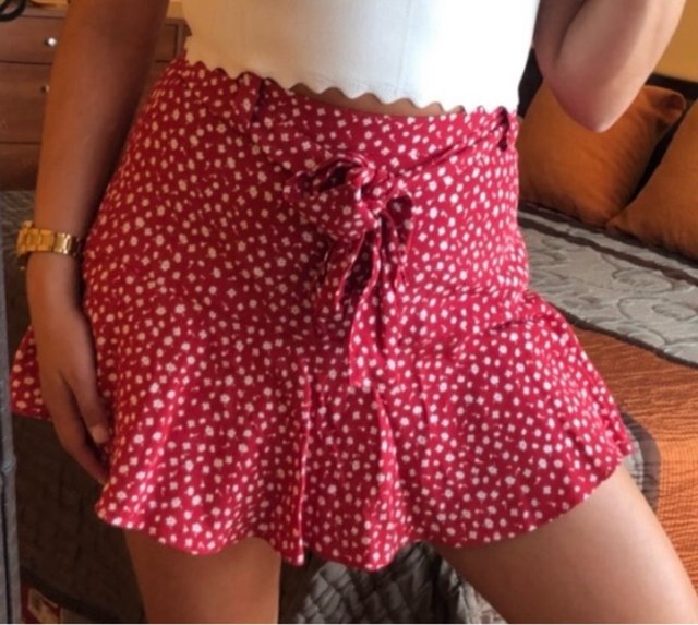 Falda fluida en color rojo con estampado de flores blancas.