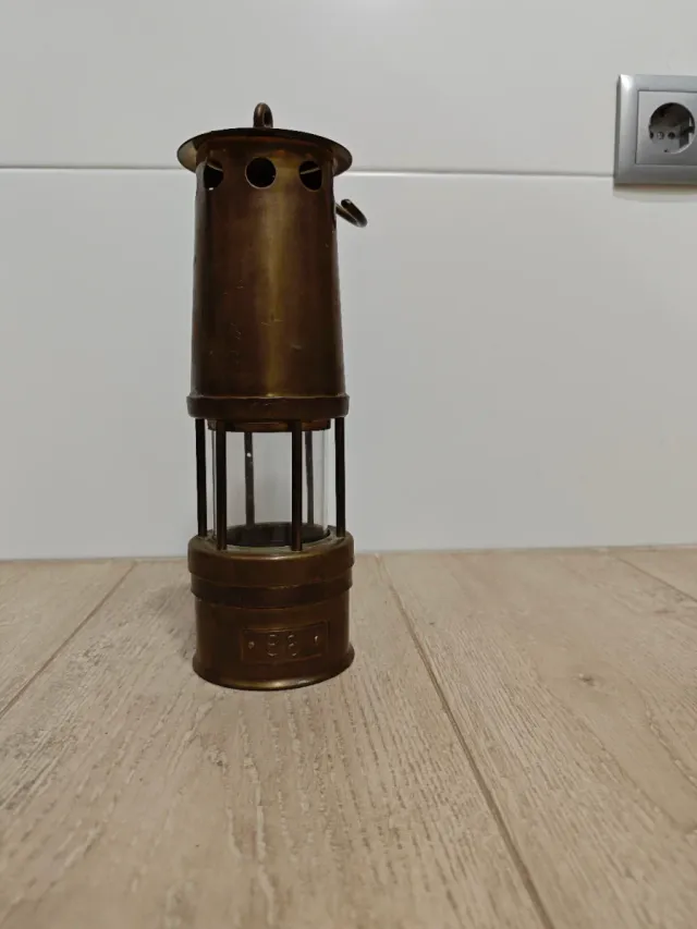 Detalles del productoAuténtico farol de minero, fabricado en latón con detalles en cristal. Presenta un diseño clásico y robusto, con un asa para colgar y un número grabado en la base.