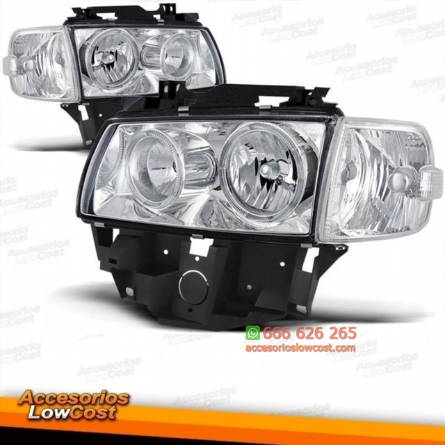 Detalles del productoREF: AL005685 DESCRIPCIÓN Faros delanteros VOLKSWAGEN TRANSPORTER. Válido para: VW T4 (Sólo modelos desde 08.1997 a 03.2003). Variante: Caravelle / Multivan. Solo válido para modelos con faros Halógenos. Posibilidad de envío de un kit de bombillas led H7 / H7 o xenón. Especificaciones: Modelo: Ojos de Angel. Tecnología: Halógeno. Tipo de bombilla: H7 / H7. Color: Cristal claro / Fondo Cromo Regulación eléctrica: Si. Homolación Europea. Los faros incluyen el E-Mark (Certificado Europeo) grabado en el cristal. Montaje. Instalación sencilla sin necesidad de modificación en el vehículo. Juego completo. El kit se compone de