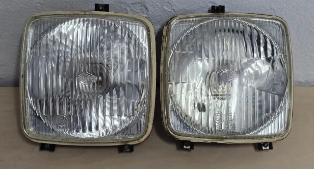 Pareja de faros para Pegaso. - Lente de cristal con diseño estriado. - Marco exterior de plástico. - Soportes de montaje metálicos.