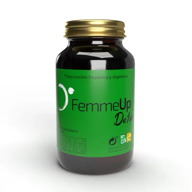 Detalles del productoFemmeUp Detox es un complemento alimenticio natural que ayuda a la depuración hepática y digestiva, mejorando el bienestar general.