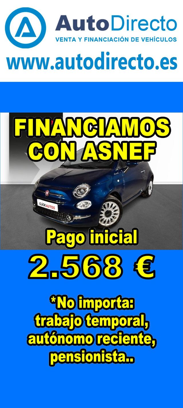 Detalles del producto¿No consigues financiación? ¡Tenemos la solución! *************************************************************************** RENT CREDIT: Aprobamos más del 90% de las operaciones. No importa ASNEF o RAI, impagos pendientes, ser autónomo o empresa reciente, ser pensionista. Imprescindible pago inicial del 20%. Ejemplo de operación: FIAT 500 1.0 HYBRID 70CV DOLCEVITA. Ref. W956365MDP - Precio vehículo financiado: 12840 €. - Pago inicial de 2568 €. - Cuota mes desde 272 €. - Impuesto de circulación y garantía (mínimo 1 año) incluidos. *************************************************************************** ✅ Más de 3.000 COCHES Y FURGONETAS EN STOCK. ✅ HASTA 2 AÑOS DE GARANTIA. ✅ Kilómetros certificados. ✅ 17 concesionarios repartidos en toda España. ♻️ Aceptamos tu coche como parte del pago. *************************************************************************** IMPORTANTE: -. Este anuncio, no es vinculante, puede contener errores. SE MUESTRAN A TÍTULO INFORMATIVO Y NO CONTRACTUAL. -. Consultar disponibilidad del vehículo y datos exactos: fecha de matriculación, importes, etc,... *************************************************************************** Te ofrecemos distintas opciones: financiación, renting, alquiler con opción a compra, rent credit. En nuestro stock disponible encontraras: 3008 , qashqai , corolla , rav4 , sandero , Duster , yaris , 2008 , Tucson , Ibiza , 208 , Sportage , a3 , c4 , Formentor , q3 , yaris cross , 500 , c3 , arona , zs , x1 , kona , corsa , clase a , león , 308 , serie 1 , golf , focus , captur , a1 , tiguan , i20 , t roc , stonic , xc40 , civic , q5 , serie 3 , glb , 5008 , ateca , clio , kuga , c hr , i30 , arkana , juke , a4 , x3 , cx 5 , xc60 , kamiq , taigo , Mustang , x6 , polo , ceed , karoq , x2 , Astra , niro , cx 30 , a5 , cooper , megane , moka , fiesta , hs , q2 , clase c , serie 3 , renegade , picanto.