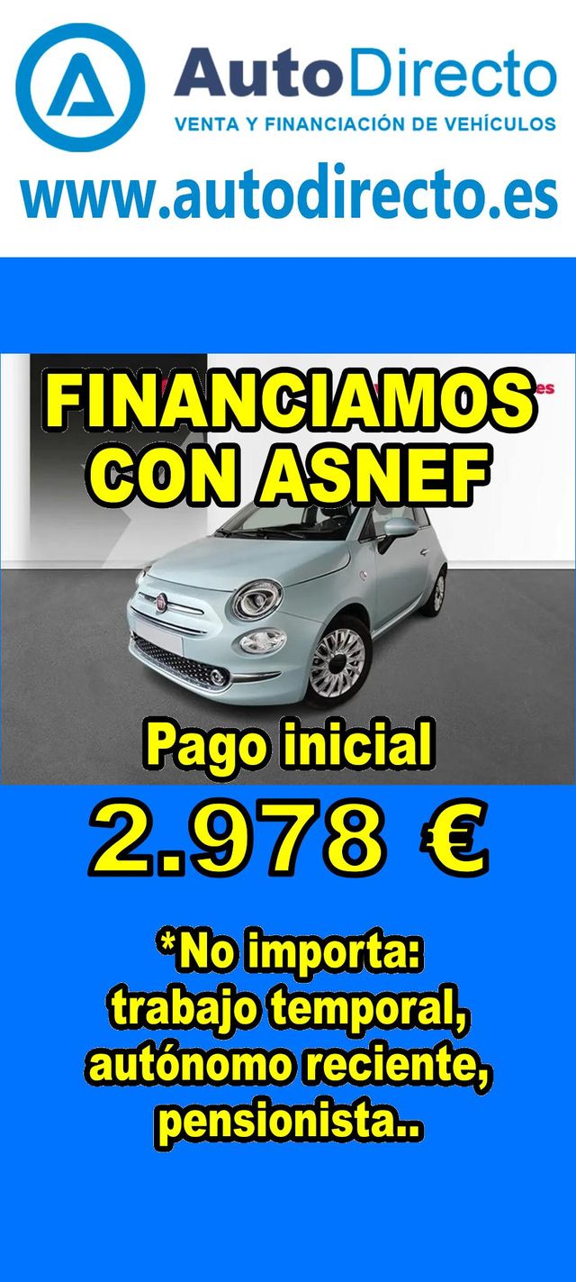 Detalles del producto¿No consigues financiación? ¡Tenemos la solución! *************************************************************************** RENT CREDIT: Aprobamos más del 90% de las operaciones. No importa ASNEF o RAI, impagos pendientes, ser autónomo o empresa reciente, ser pensionista. Imprescindible pago inicial del 20%. Ejemplo de operación: FIAT 500 1.0 HYBRID 70CV DOLCEVITA. Ref. W951854MNB - Precio vehículo financiado: 14890 €. - Pago inicial de 2978 €. - Cuota mes desde 313 €. - Impuesto de circulación y garantía (mínimo 1 año) incluidos. *************************************************************************** ✅ Más de 3.000 COCHES Y FURGONETAS EN STOCK. ✅ HASTA 2 AÑOS DE GARANTIA. ✅ Kilómetros certificados. ✅ 17 concesionarios repartidos en toda España. ♻️ Aceptamos tu coche como parte del pago. *************************************************************************** IMPORTANTE: -. Este anuncio, no es vinculante, puede contener errores. SE MUESTRAN A TÍTULO INFORMATIVO Y NO CONTRACTUAL. -. Consultar disponibilidad del vehículo y datos exactos: fecha de matriculación, importes, etc,... *************************************************************************** Te ofrecemos distintas opciones: financiación, renting, alquiler con opción a compra, rent credit. En nuestro stock disponible encontraras: 3008 , qashqai , corolla , rav4 , sandero , Duster , yaris , 2008 , Tucson , Ibiza , 208 , Sportage , a3 , c4 , Formentor , q3 , yaris cross , 500 , c3 , arona , zs , x1 , kona , corsa , clase a , león , 308 , serie 1 , golf , focus , captur , a1 , tiguan , i20 , t roc , stonic , xc40 , civic , q5 , serie 3 , glb , 5008 , ateca , clio , kuga , c hr , i30 , arkana , juke , a4 , x3 , cx 5 , xc60 , kamiq , taigo , Mustang , x6 , polo , ceed , karoq , x2 , Astra , niro , cx 30 , a5 , cooper , megane , moka , fiesta , hs , q2 , clase c , serie 3 , renegade , picanto.