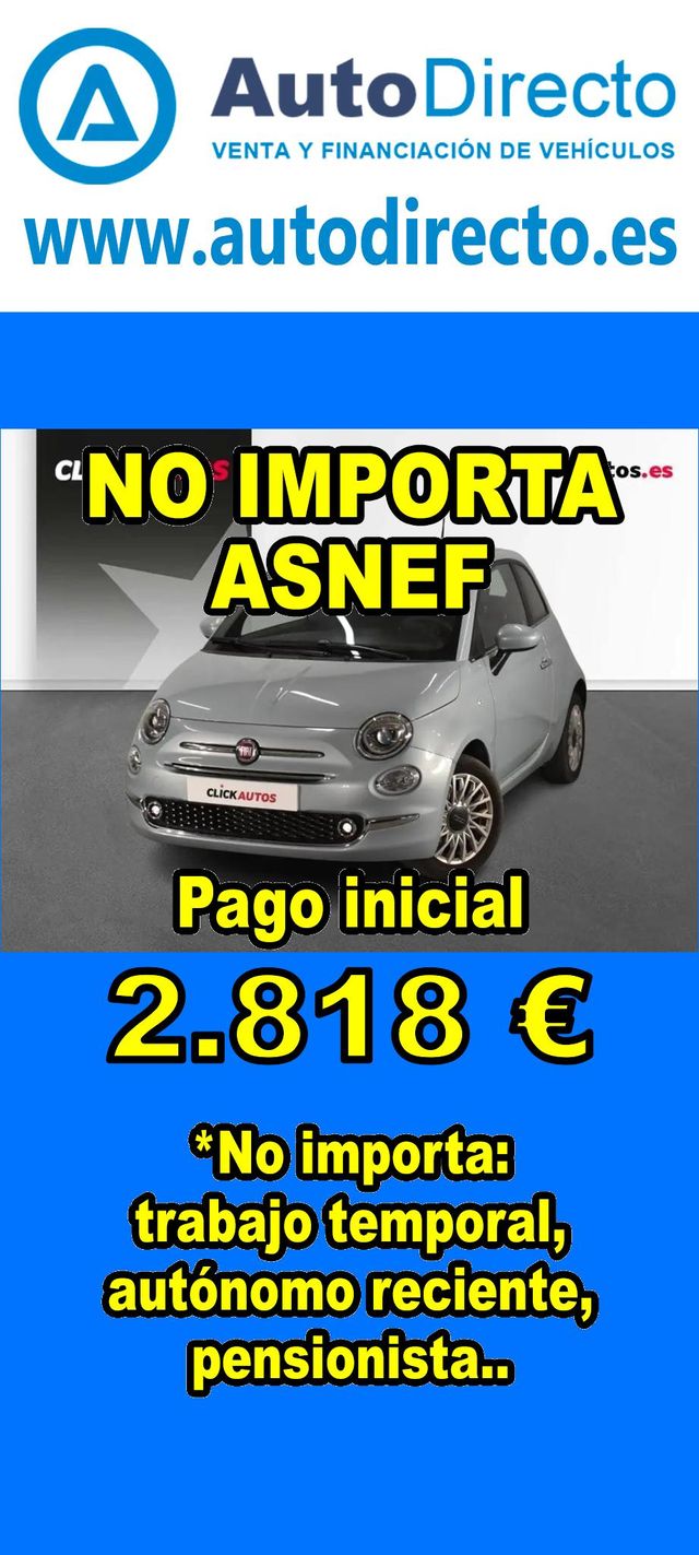 Detalles del producto¿No consigues financiación? ¡Tenemos la solución! RENT CREDIT (Alquiler con opción a compra) *************************************************************************** Aprobamos más del 90% de las operaciones. No importa ASNEF o RAI, impagos pendientes, ser autónomo o empresa reciente, ser pensionista. Imprescindible aportación inicial del 20%. Ejemplo de operación: FIAT 500 1.0 HYBRID 70CV DOLCEVITA. Ref. W951832MNB - Precio vehículo: 14090 €. - Aportación inicial de 2818 €. - Cuota mes desde 297 €. - Impuesto de circulación y garantía de 1 año incluidos. *************************************************************************** ✅ Más de 3.000 VEHÍCULOS EN STOCK. ✅ Kilómetros certificados. ✅ 17 concesionarios repartidos en toda España. ♻️ Aceptamos tu coche como parte de la operación. *************************************************************************** IMPORTANTE: -. Este anuncio, no es vinculante, puede contener errores. SE MUESTRAN A TÍTULO INFORMATIVO Y NO CONTRACTUAL. -. Consultar disponibilidad del vehículo y datos exactos: fecha de matriculación, importes, etc,... *************************************************************************** Te ofrecemos distintas opciones: Venta al contado, financiación, renting, RENT CREDIT (Alquiler con opción a compra).