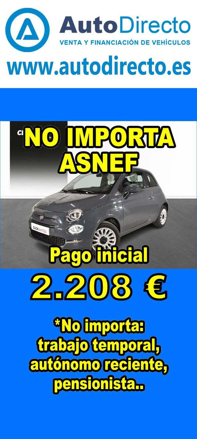 Detalles del producto¿No consigues financiación? ¡Tenemos la solución! RENT CREDIT (Alquiler con opción a compra) *************************************************************************** Aprobamos más del 90% de las operaciones. No importa ASNEF o RAI, impagos pendientes, ser autónomo o empresa reciente, ser pensionista. Imprescindible aportación inicial del 20%. Ejemplo de operación: FIAT 500C 1.0 HYBRID 70CV DOLCEVITA. Ref. W953435LYD - Precio vehículo: 11040 €. - Aportación inicial de 2208 €. - Cuota mes desde 235 €. - Impuesto de circulación y garantía de 1 año incluidos. *************************************************************************** ✅ Más de 3.000 VEHÍCULOS EN STOCK. ✅ Kilómetros certificados. ✅ 17 concesionarios repartidos en toda España. ♻️ Aceptamos tu coche como parte de la operación. *************************************************************************** IMPORTANTE: -. Este anuncio, no es vinculante, puede contener errores. SE MUESTRAN A TÍTULO INFORMATIVO Y NO CONTRACTUAL. -. Consultar disponibilidad del vehículo y datos exactos: fecha de matriculación, importes, etc,... *************************************************************************** Te ofrecemos distintas opciones: Venta al contado, financiación, renting, RENT CREDIT (Alquiler con opción a compra).