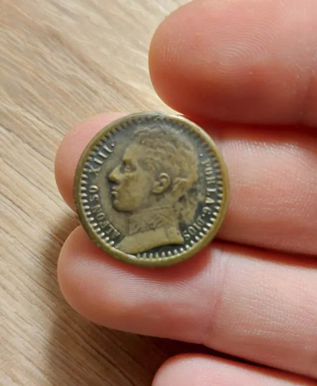 Ficha de época del reinado de Alfonso XIII. - Diseño con retrato del rey. - Inscripción ALFONSO XIII POR LA G. DE DIOS. - Escudo de Castilla al doros
