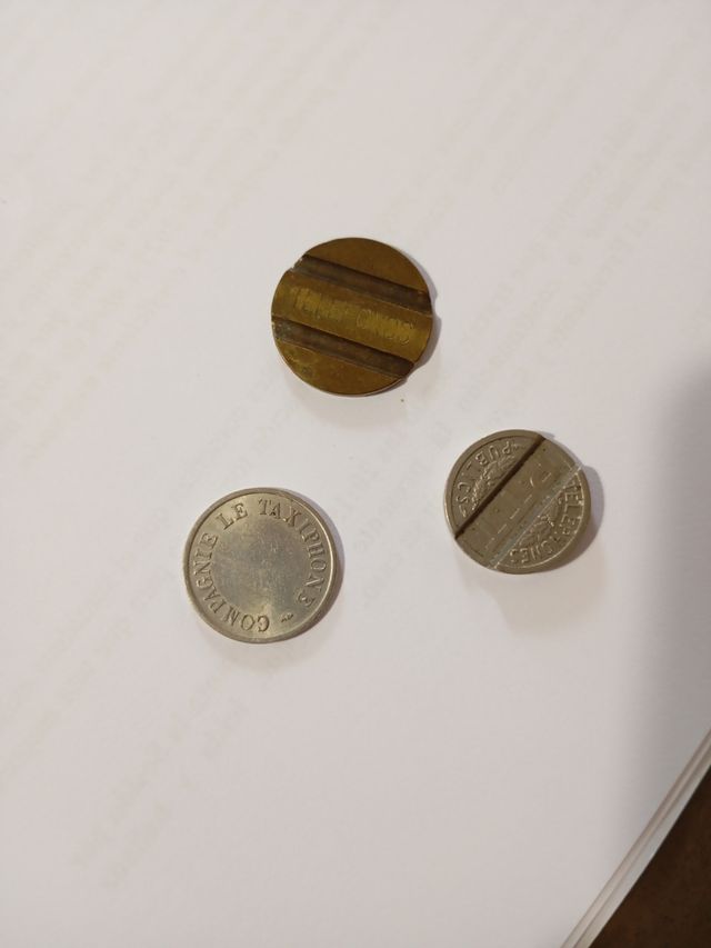 Tres fichas de teléfono de mediados del pasado siglo. Una española, otra francesa y la tercera quizás belga.