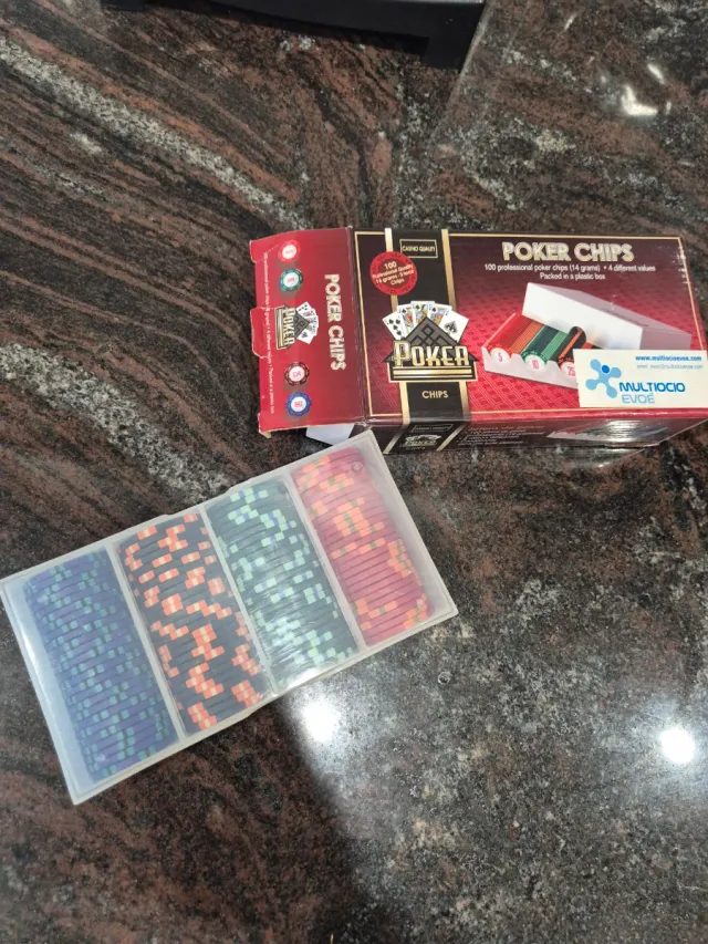 Detalles del productoSet de 100 fichas de póker profesionales de 14 gramos, con 4 valores diferentes. Vienen empaquetadas en una caja de plástico.