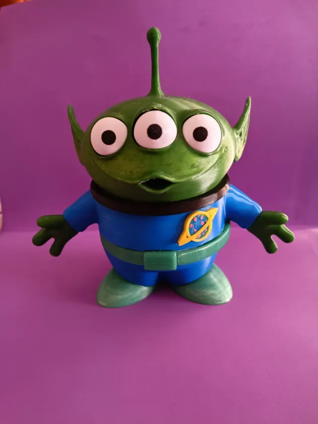 Figura del personaje alienígena de Toy Story. - Color verde. - Traje azul con cinturón y emblema. - Tres ojos característicos.