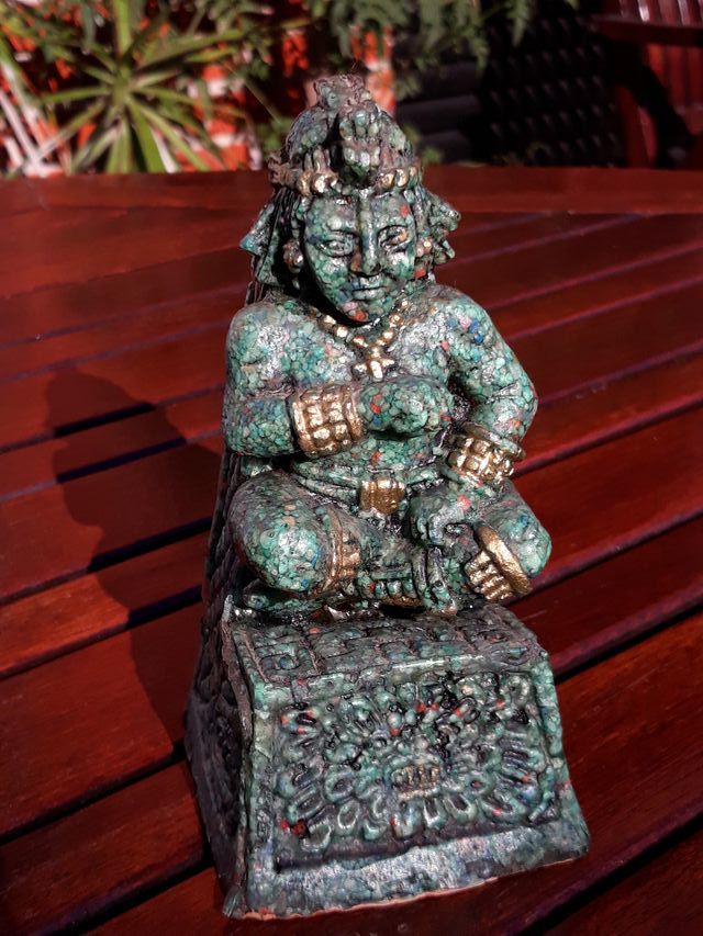 Detalles del productoFigura de arte azteca de guerrero sentado hecha en piedra de malaquita. Adquirida en México.