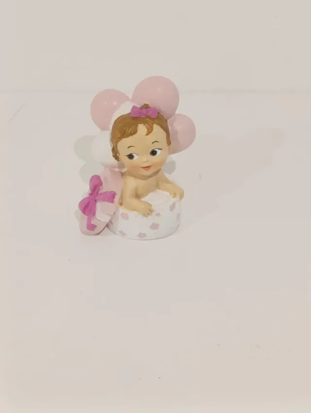 Detalles del productoFigura decorativa de un bebé saliendo de una caja de regalo, adornado con globos.