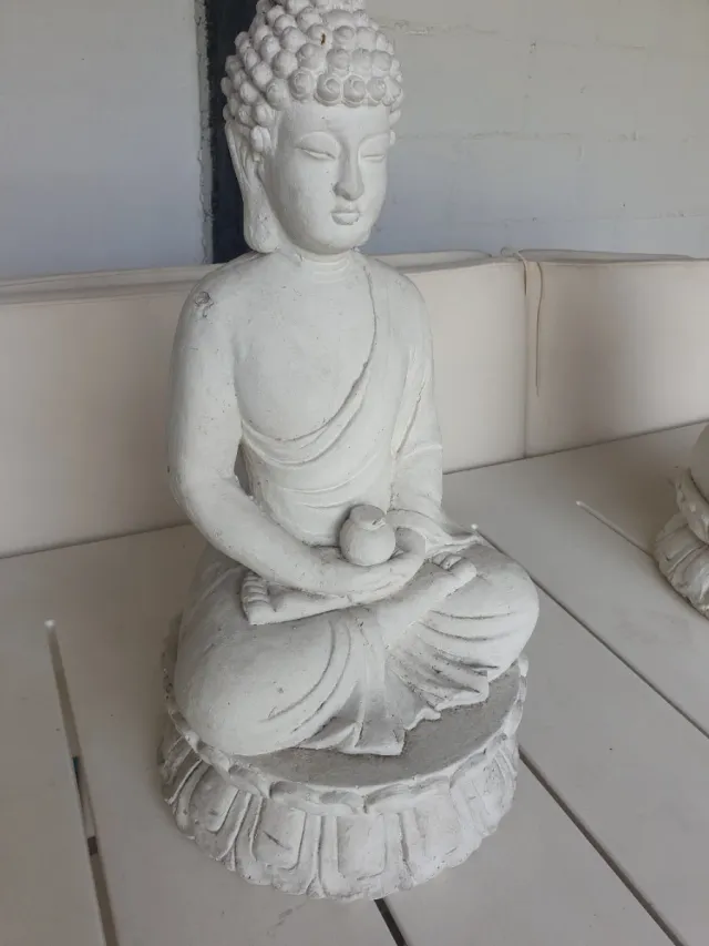 Figura decorativa de Buda 55cm sentada, elaborada en piedra,tiene un pequeñito golpe en el hombro.
