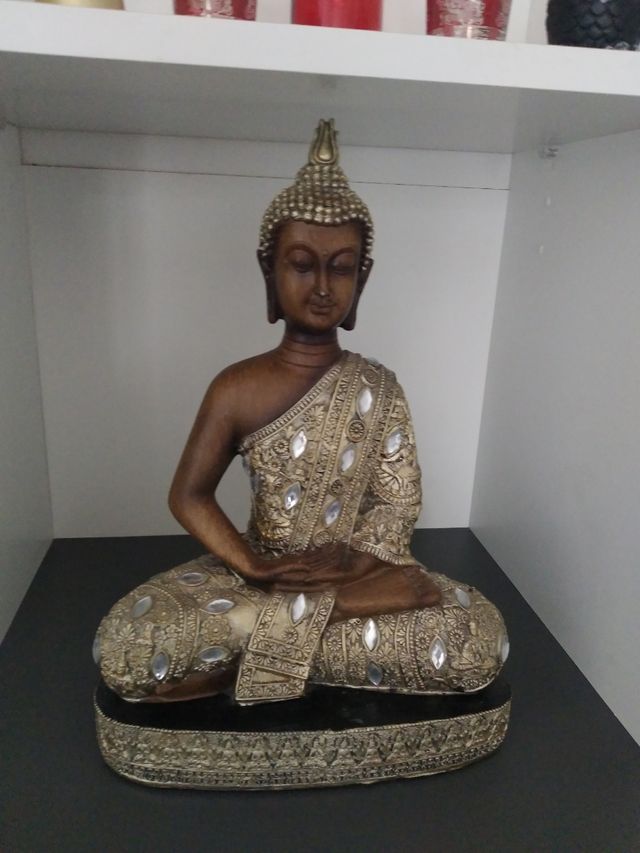 Detalles del productoFigura decorativa de Buda en posición de meditación. Elaborada con detalles intrincados y adornos.