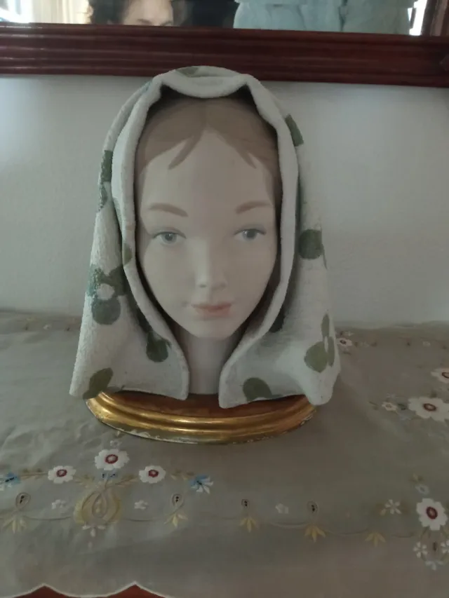 Figura decorativa de cabeza de porcelana. Valorada en 775$ - Diseño clásico. - Base dorada. - Pañuelo estampado.
