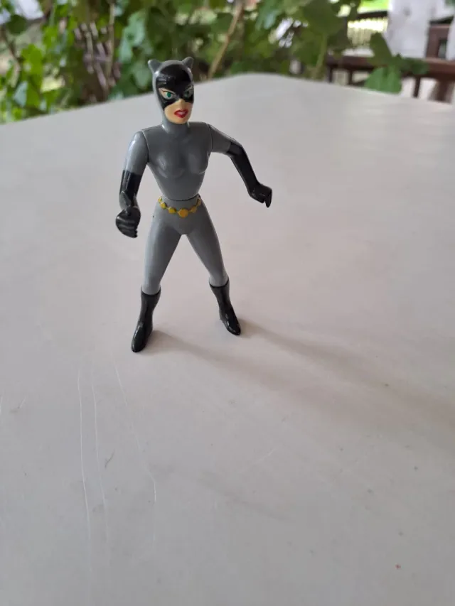 Figura de Cat Woman, personaje icónico. - Diseño detallado en color gris. - Incluye cinturón amarillo. - Botas y guantes negros. - Tamaño 9 cm