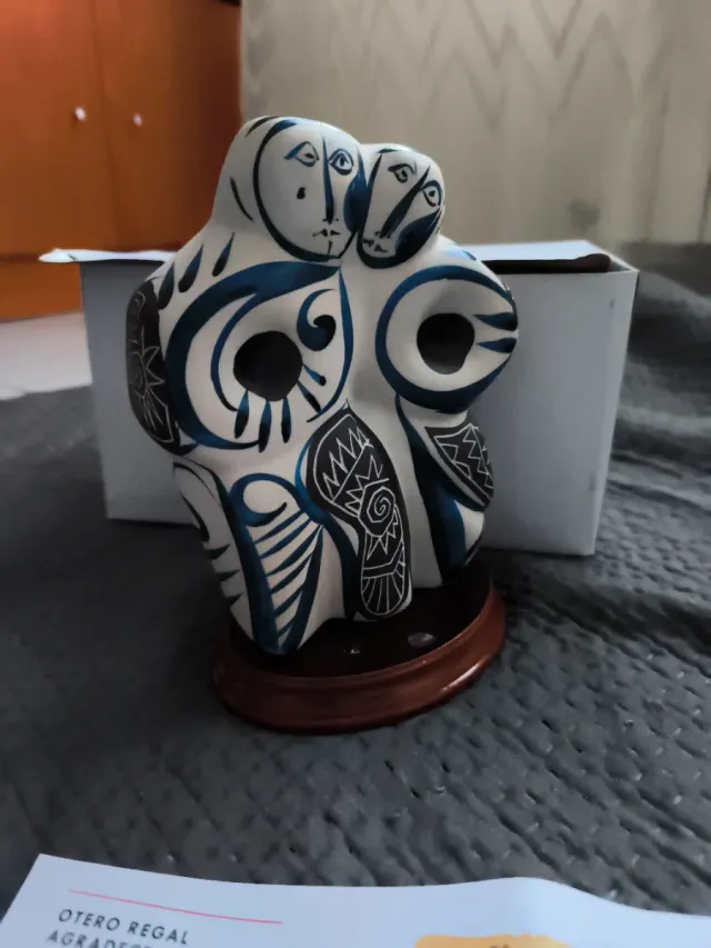 Detalles del productoFigura decorativa de cerámica con un diseño abstracto y moderno. Presenta detalles en color azul y negro sobre fondo blanco, con una base de madera.
