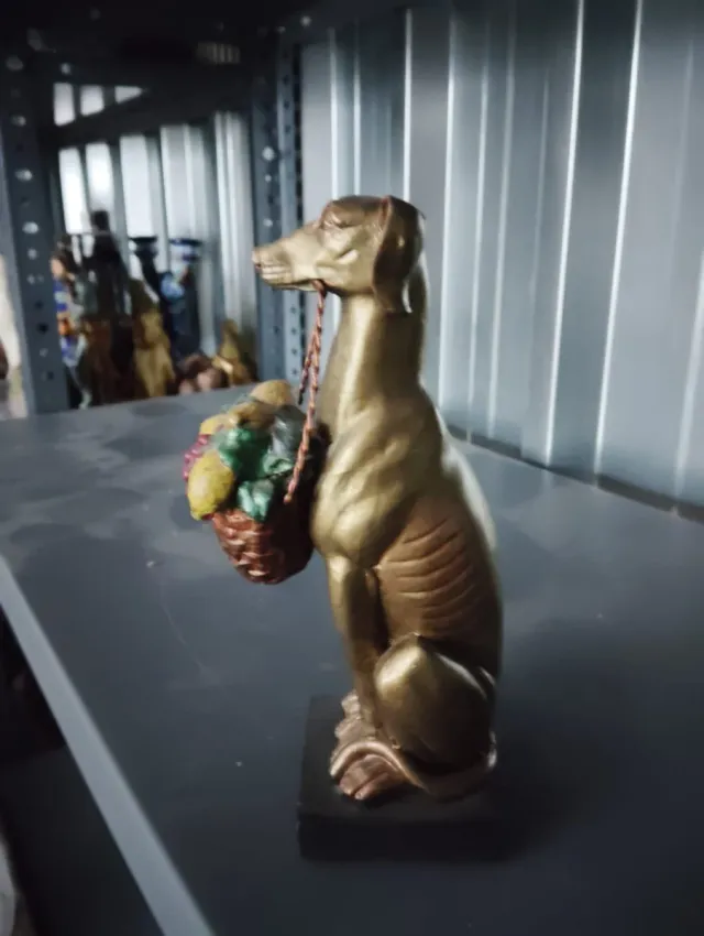 Detalles del productoFigura decorativa de un perro sentado, con un estilo clásico y un acabado que simula bronce. Lleva una cesta con frutas en la boca.