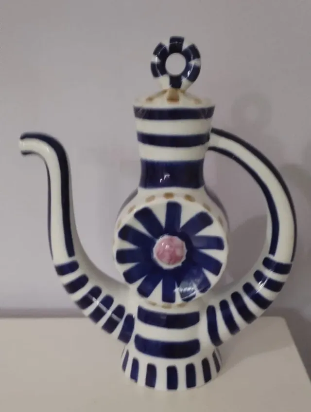 Detalles del productoFigura decorativa de cerámica de Sargadelos. Presenta un diseño llamativo con rayas azules y detalles dorados.