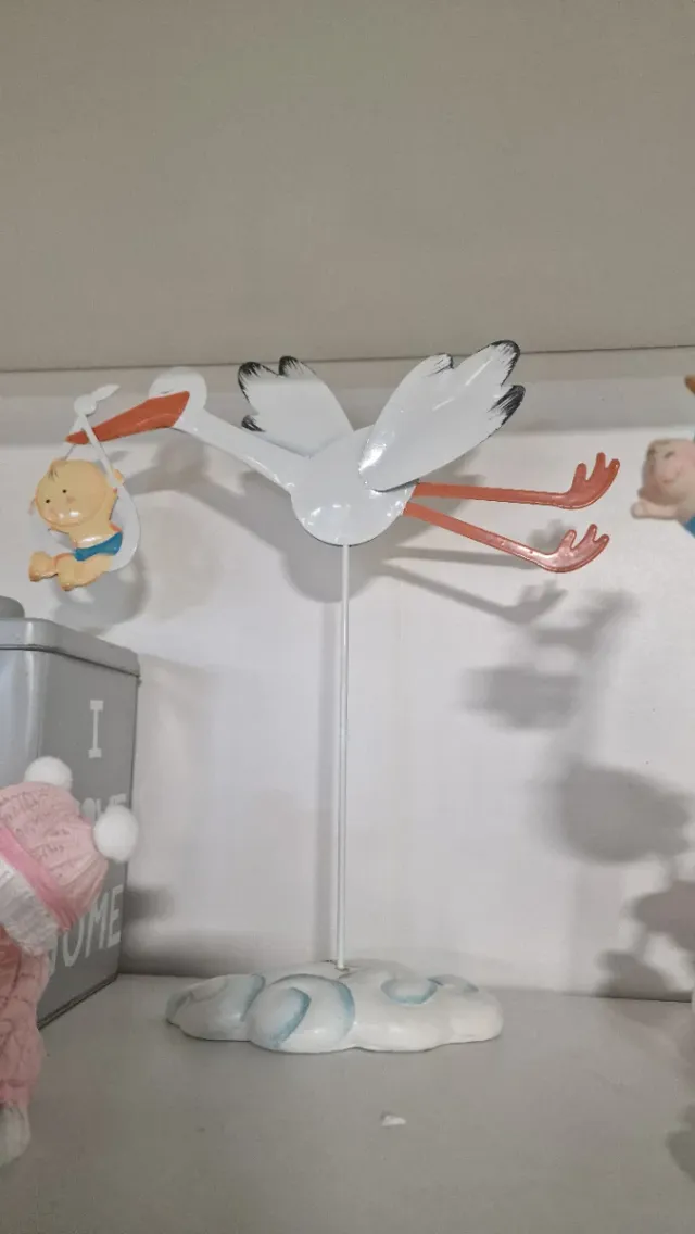 Detalles del productoFigura decorativa de una cigüeña portando un bebé, ideal para tartas de bautizo o decoración.