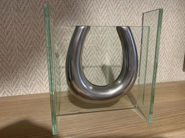 Figura decorativa moderna con forma de herradura. - Materiales: Aluminio y cristal. - Diseño elegante y minimalista.