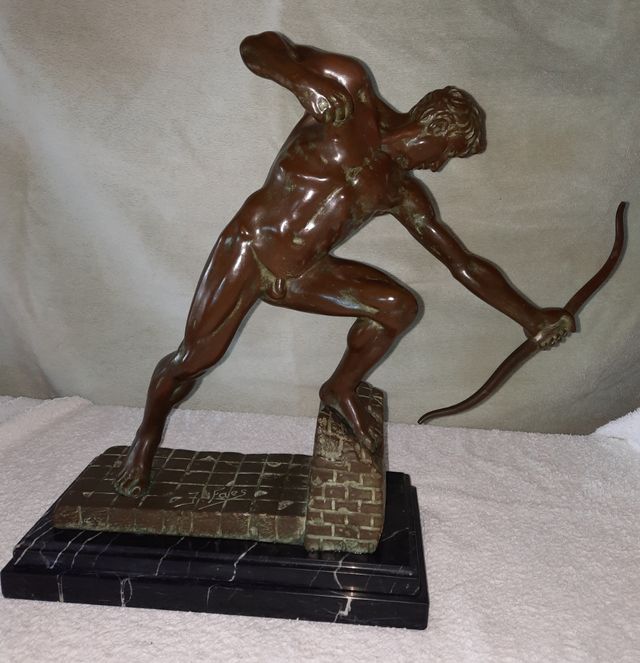 Figura de bronce representando un arquero sobre peana de mármol negro. Firmado F. Faes Altura con peana 38,5 cm.