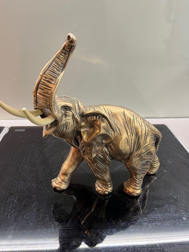 Elegante figura decorativa de un elefante con la trompa levantada. Fabricada en bronce con detalles realistas. - Material: Bronce. - Diseño detallado.
