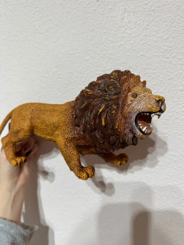 Figura detallada de un león con melena y expresión de rugido. - Color marrón y dorado. - Diseño realista.