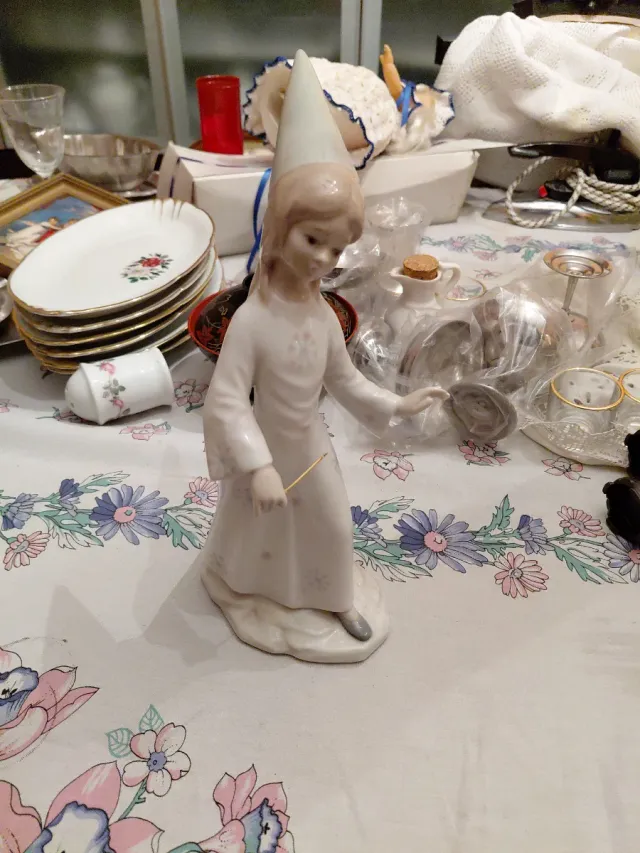 Figura de porcelana de una niña con un sombrero cónico y un vestido blanco. - Detalle de estrellas en el vestido. - Sostiene una varita dorada.
