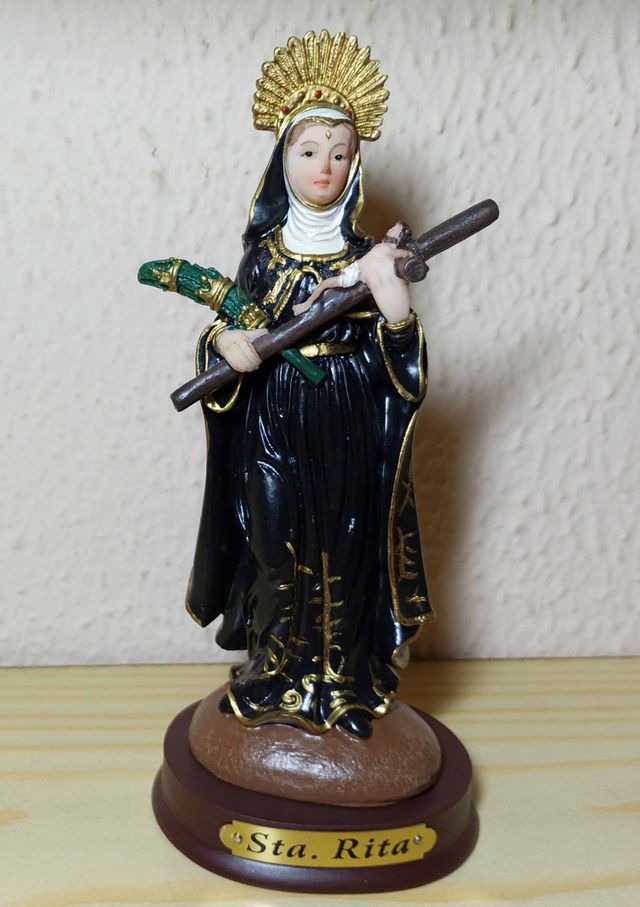 Figura religiosa de resina de Santa Rita de Casia, marca Marfinites. Mide 15 cm de alto. En buen estado. Peso: unos 140 grs.