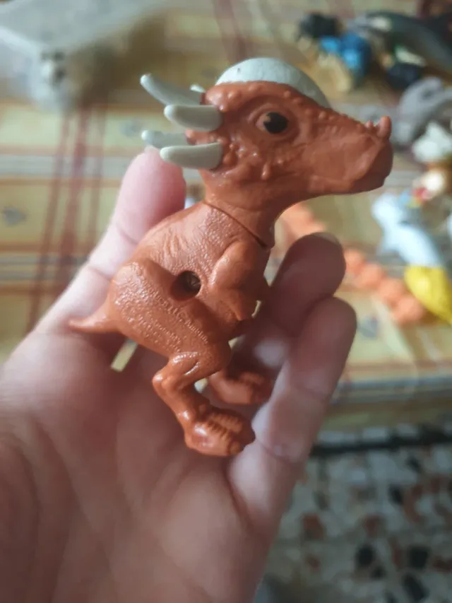 Detalles del productoFigura de dinosaurio de la colección de Mc Donalds. Es de color naranja con detalles en blanco en la cabeza y cuernos.