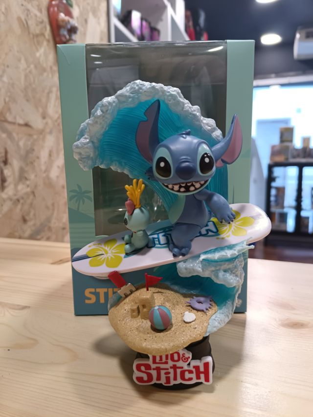 Detalles del producto🏄♂️🌺 ¡Stitch se lanza a las olas en esta espectacular figura D-Stage 030! Capturado en plena acción surfera, este modelo combina el encanto travieso del experimento 626 con una escena dinámica y veraniega, perfecta para los fans más acérrimos de Lilo & Stitch. 🐚🌊